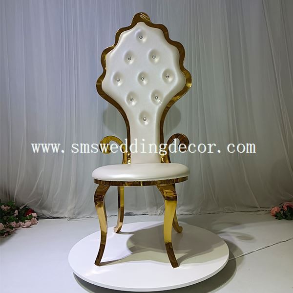 Ova stolica sa visokim naslonom je napravljena od nerđajućeg čelika kao okvir, pozlaćen-, koji neće izblijedjeti i sjajiti. Moderna stolica s tronom ima sjedište i naslon presvučen bijelom kožom- sa mekim debelim podlogama koji su ugrađeni kako bi bili udobni. Ima sjedište veličine 54 cm * 52 cm. Visina stolice je 148 cm.